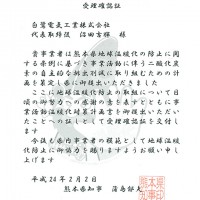 平成23年に続き、平成24年も熊本県より、8月29日に「熊本県森林吸収量認証書」が授与されました。「ふれあいの森 白鷺」の植林活動に対して、年間10.72tの二酸化炭素吸収量が認証されました。