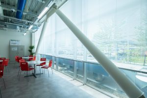 またこの本社ビルには、女性が活躍できる快適な環境、縛りのない自由な発想が生まれるフリーアドレス制やスタンディングデスクが導入され、ブレイクタイムのためのカフェコーナー、地中熱を利用した空調・湿度の最適化など、多角的な視点から社員の能力と健康が守られる環境を整えられています。